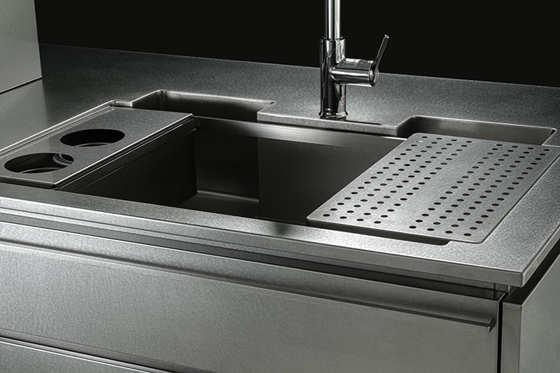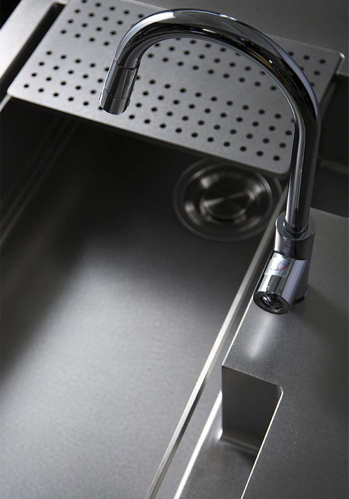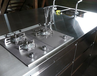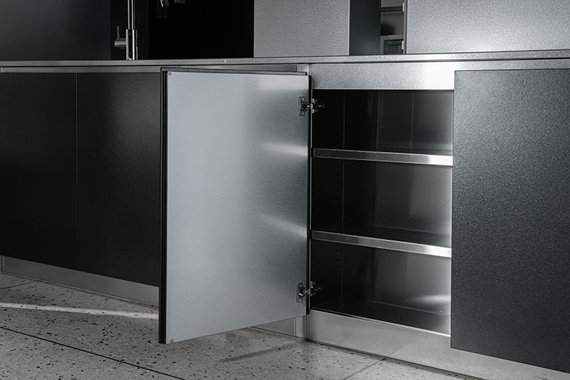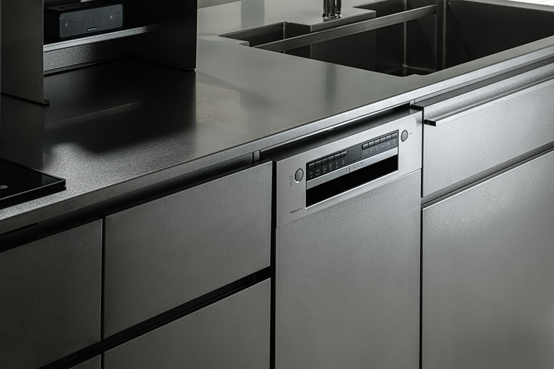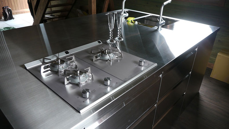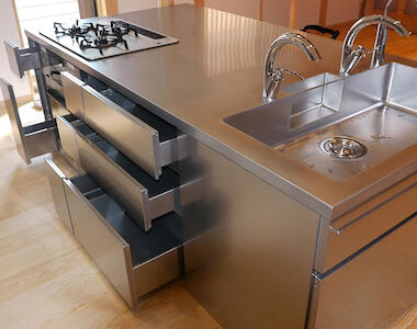 シンバウトのキッチンはオールステンレス製です。天板やパネル内には樹脂や木材などを一切使用しません。また補強にもステンレスを使っていますので、素晴らしい耐久性を発揮します。長期に渡って錆びることなく、同時に臭いが付着することもありません。さらにメンテナンスが容易であることも含め、いつまでも美しい状態を維持することができます。