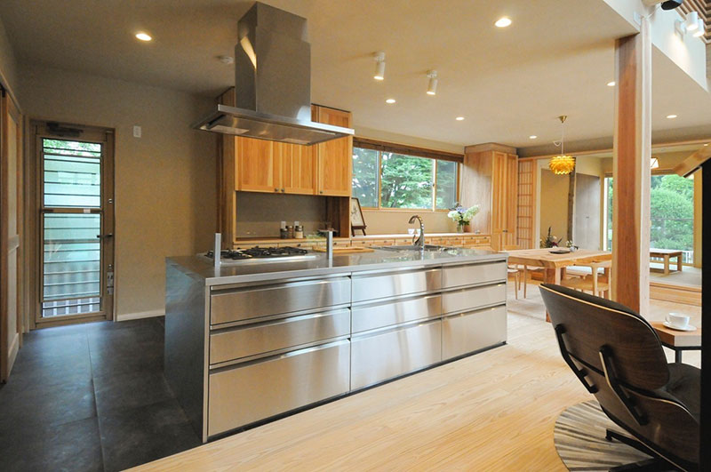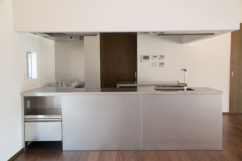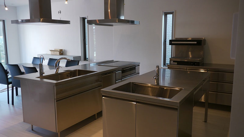 プロ用厨房のようなイメージですが、ステンレスの輝きがいっそう映える美しいキッチンとなっています。