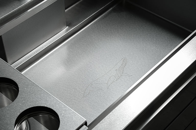 シンバウトのキッチン(シンクの中)にはレーザー加工によるクジラが描かれています。キッチンで過ごす時間を少しでも豊かなひとときにしたい。