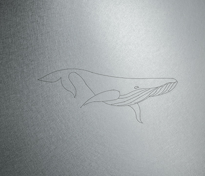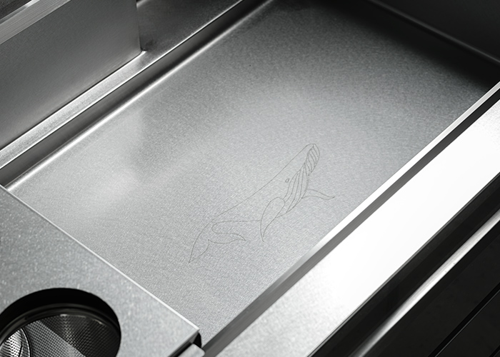 シンバウトのキッチン(シンクの中)にはレーザー加工によるクジラが描かれています。キッチンで過ごす時間を少しでも豊かなひとときにしたい。