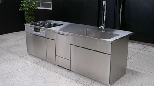 シンバウトのキッチンはオールステンレス製です。天板やパネル内には樹脂や木材などを一切使用しません。また補強にもステンレスを使っていますので、素晴らしい耐久性を発揮します。長期に渡って錆びることなく、同時に臭いが付着することもありません。さらにメンテナンスが容易であることも含め、いつまでも美しい状態を維持することができます。